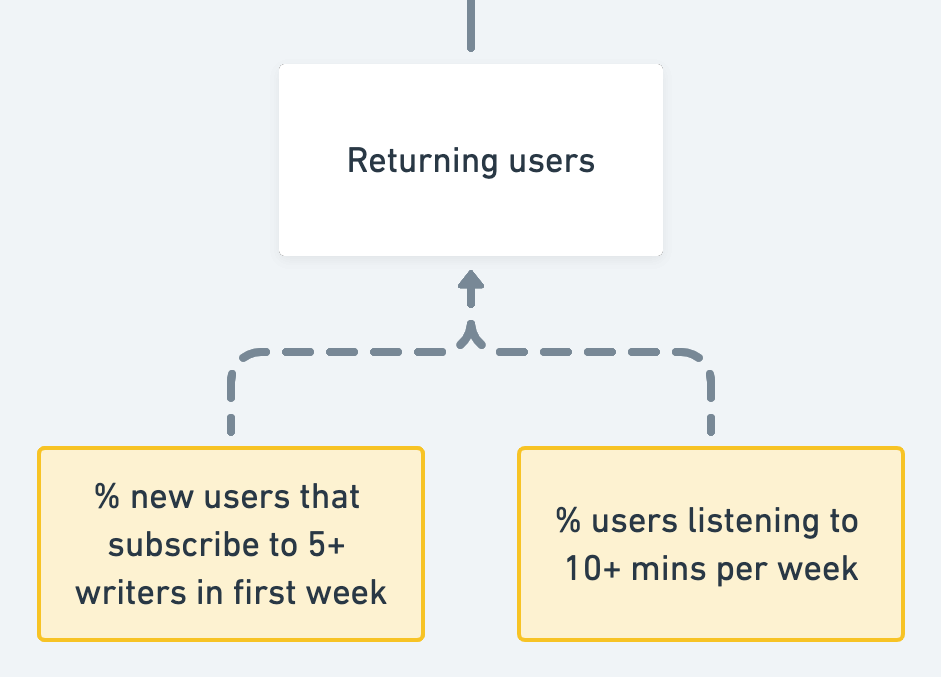 Retention, however, was much harder to break down. So they conducted user research: they spent time listening to users to understand which outcomes (behaviors) made them likely to return. But they’re still learning about the relationship, which is why the KPIs related to retention are indicated with dotted lines: these are hypotheses.